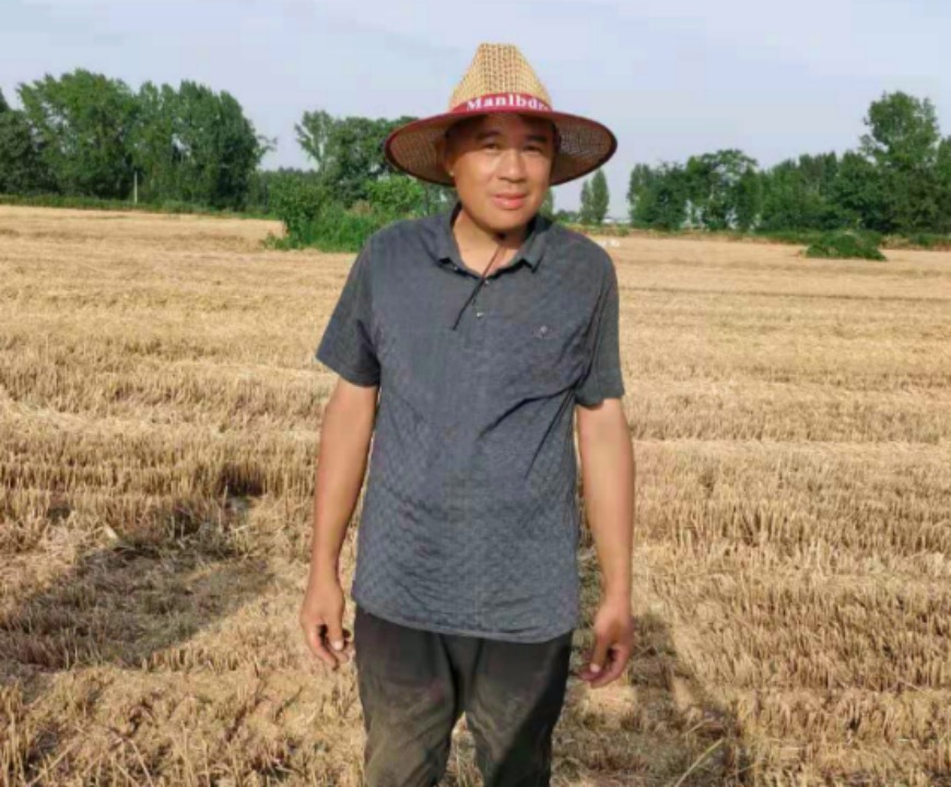 6月6日下午,先導(dǎo)航到了吳大哥的養(yǎng)殖廠,再按照熱心村民的指引,最終我們在一塊麥?zhǔn)盏乩镆姷搅苏β祿Р莸膮谴蟾?。吳大哥本名吳鐵,用吳大哥的話:“最終還是跟鐵疙瘩打交道。”